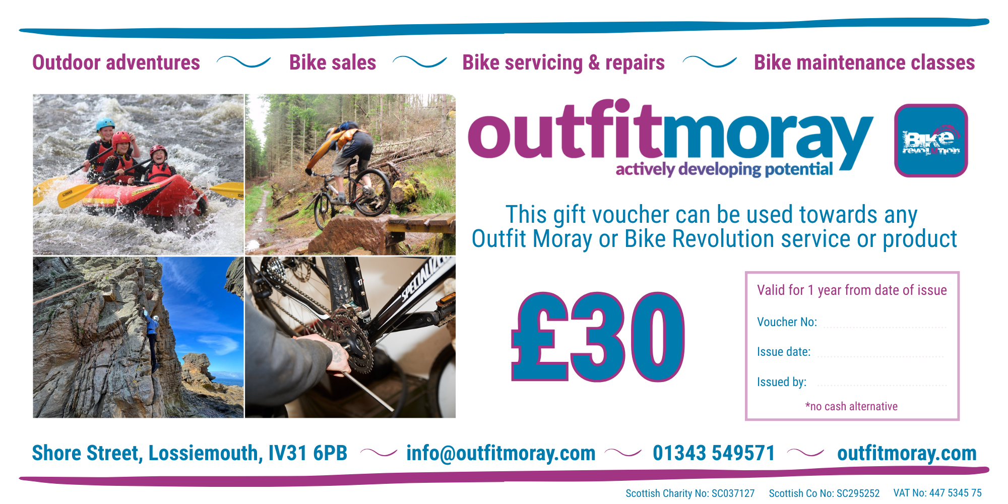 Be the coolest gift giver ever with an Outfit Moray gift voucher. Our vouchers come in £10, £15, £20, £25, £30, £50 & £100 denominations and can be put towards any of our activities, so the lucky recipient can literally choose between anything from a gorge walking adventure to a new bike!